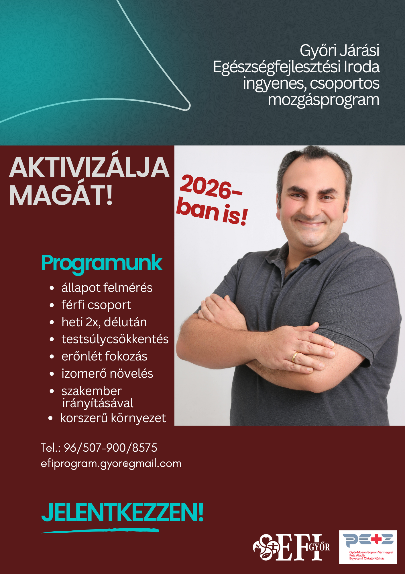 A Győri Járási Egészségfejlesztési Iroda 2025-ben indított első alkalommal kizárólag férfiaknak szóló mozgásprogramot, mely nagy sikerrel zárult, ezért idén újabb csoportba hirdetünk jelentkezési lehetőséget az aktív korú férfiaknak.