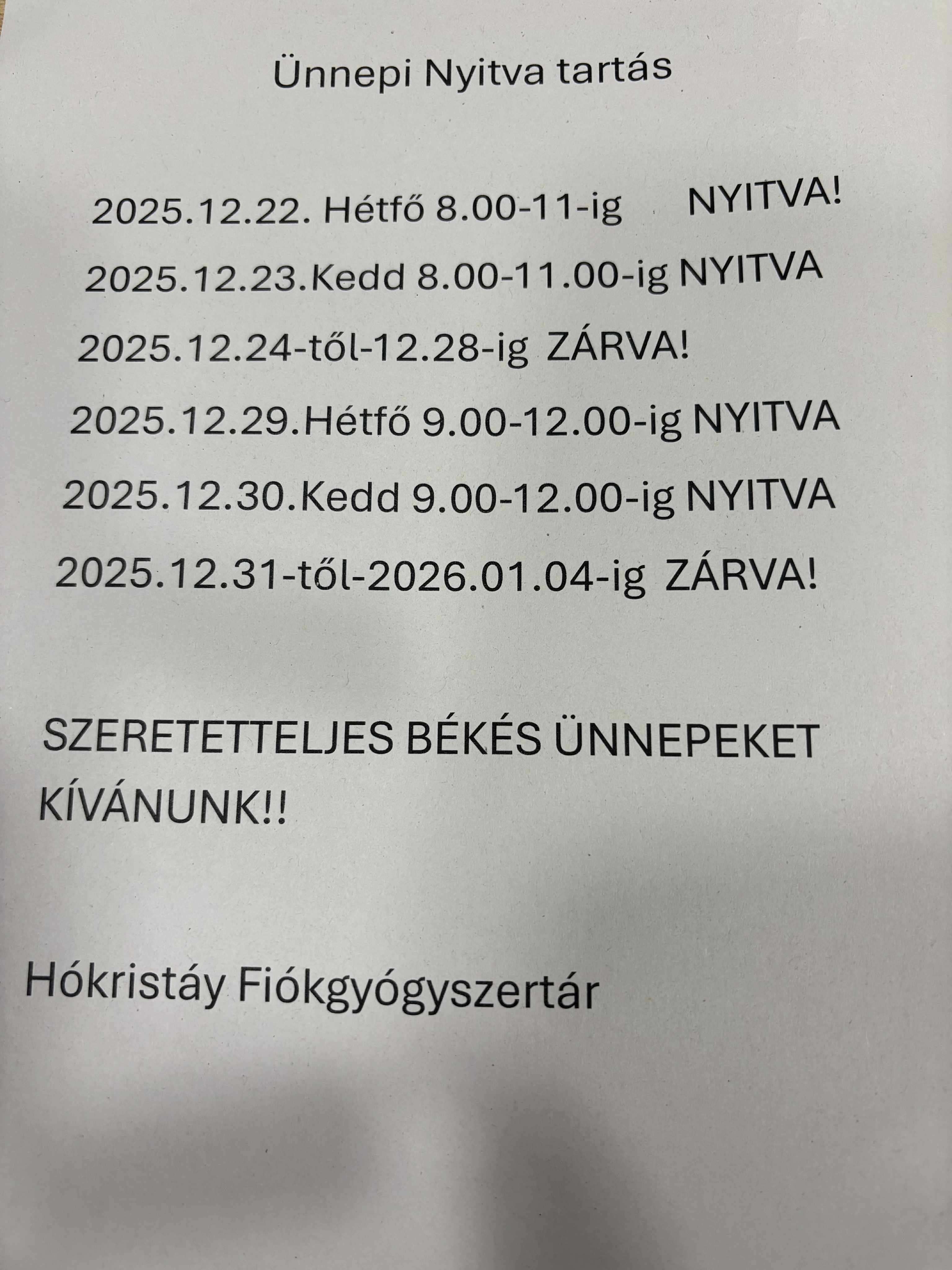 Hókristály gyógyszertár tájékoztatása ünnepi nyitva tartásról
