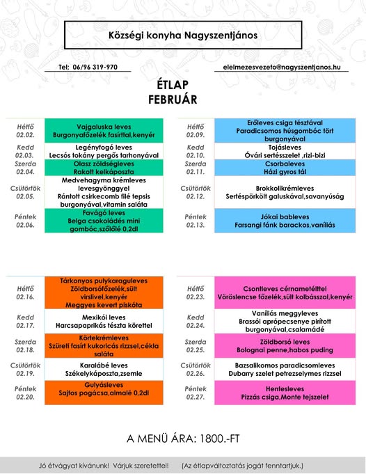 Községi Konyha Nagyszentjános február havi felnőtt étlap