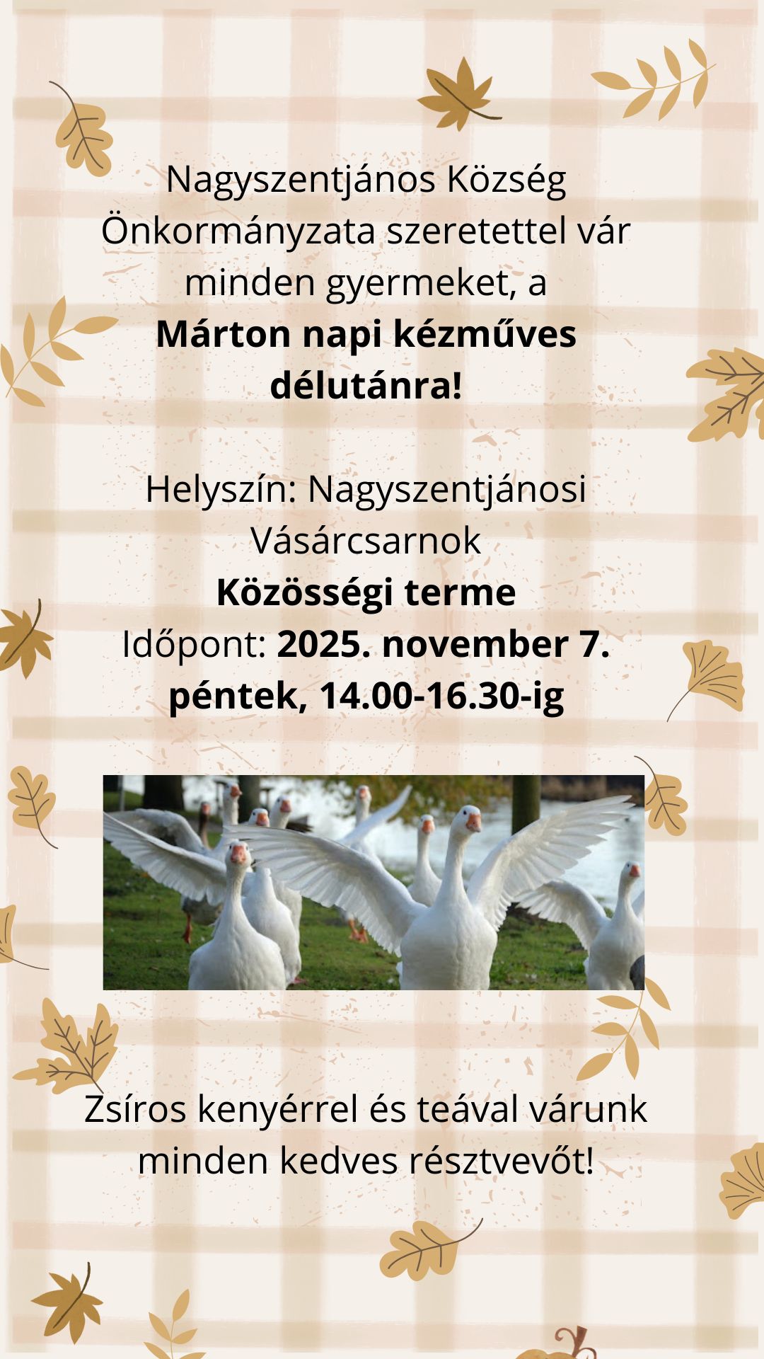 Tisztelt Lakosság! Kedves Gyerekek! Sok szeretettel várunk mindenkit a Márton napi kézműves délutánra.