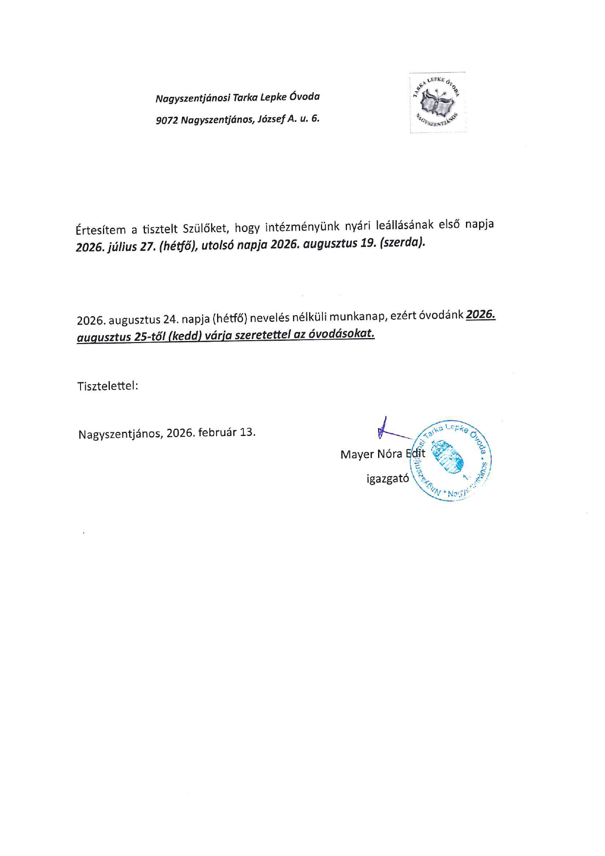 Tájékoztatás óvoda nyári zárva tartásról