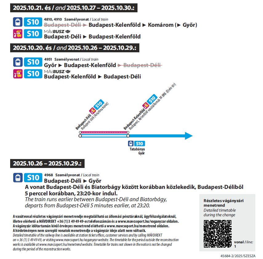 A MÁVCSOPORT tájékoztatása alapján 2025. október 20-tól október 30-ig karbantartási munkák egyes vonatok menetrendje módosul, egyes vonatok helyett Budapest-Déli és Budapest-Kelenföld között MÁVBUSZ-ok közlekednek.